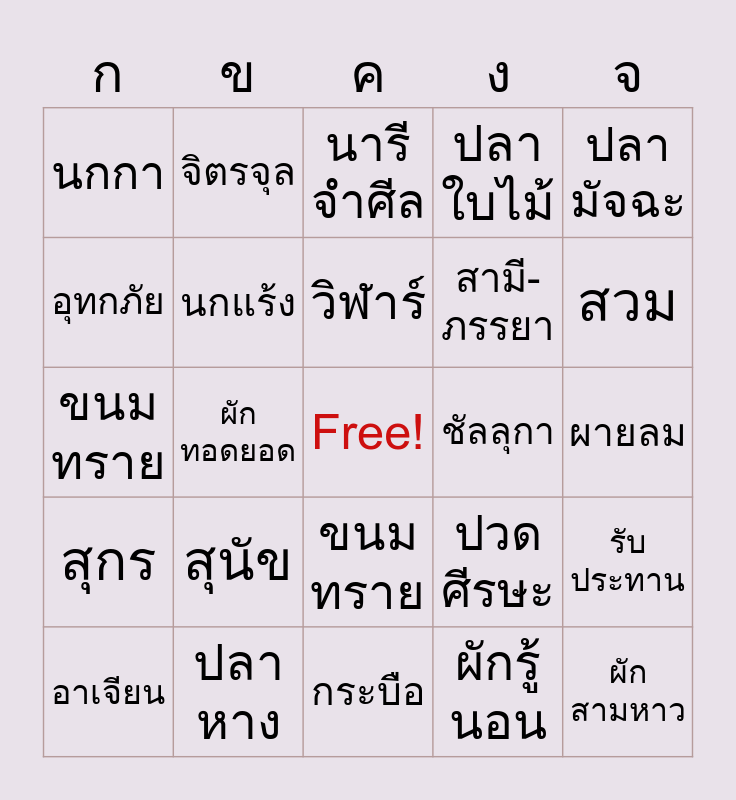 This bingo card has a free space and 29 words: ปลายาว, ปลาหาง, นารีจำศีล, ฟักเหลือง, ปลามัจฉะ, นกกา, นกแร้ง, วิฬาร์, ชัลลุกา, รับประทาน, อาเจียน, ผักทอดยอด, ผักรู้นอน, ผักสามหาว, ขนมทราย, โค, กระบือ, ปวดศีรษะ, สวม, สุกร, สุนัข, อัคคีภัย, สามี- ภรรยา, ผายลม, อุทกภัย, จิตรจุล, ขนมทราย, ปลาใบไม้ and ผลอุลิด.