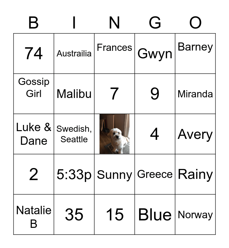 This bingo card has a free space and 29 words: Natalie B, Palm Desert, Swedish, Seattle, 8, 74, Frances, Malibu, 5:33p, 4, 35, Avery, Norway, 15, Blue, Miranda, San Diego, Sunny, 2, Barney, Luke & Dane, Greece, Full Moon, 9, Gossip Girl, Gwyn, Austrailia, Rainy, 7 and 44.
