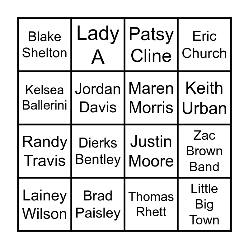This bingo card has 16 words: Brad Paisley, Zac Brown Band, Patsy Cline, Blake Shelton, Randy Travis, Lady A, Justin Moore, Thomas Rhett, Kelsea Ballerini, Jordan Davis, Lainey Wilson, Eric Church, Dierks Bentley, Keith Urban, Maren Morris and Little Big Town.