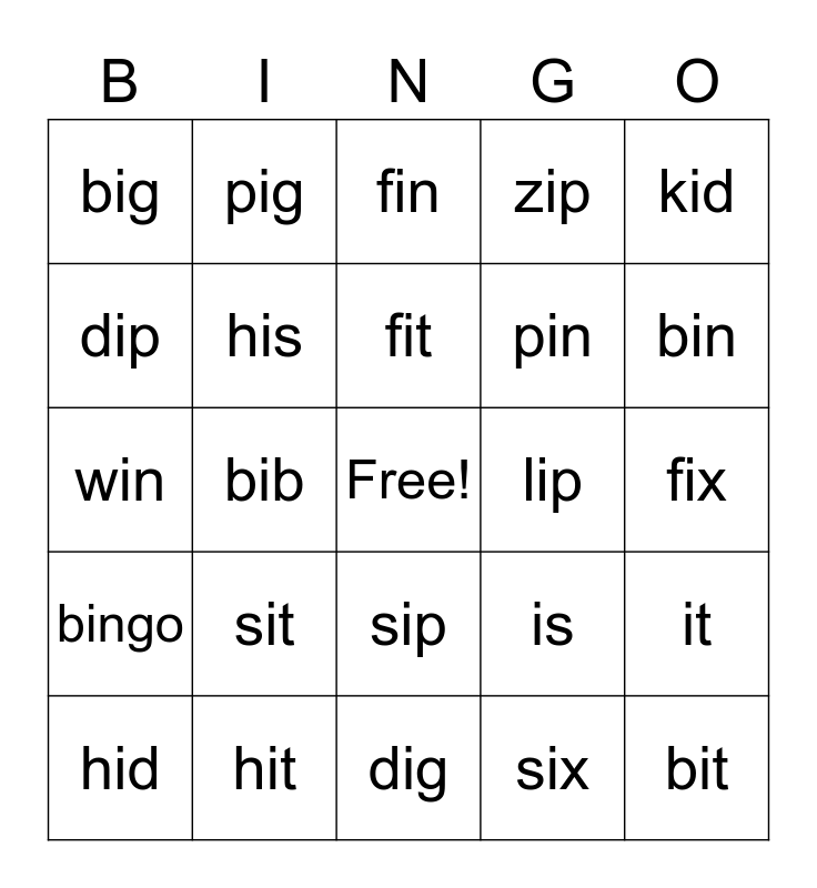 This bingo card has a free space and 24 words: sit, hit, fit, hid, kid, big, dip, pig, lip, sip, pin, win, is, it, his, six, fix, fin, bin, bib, bit, bingo, zip and dig.