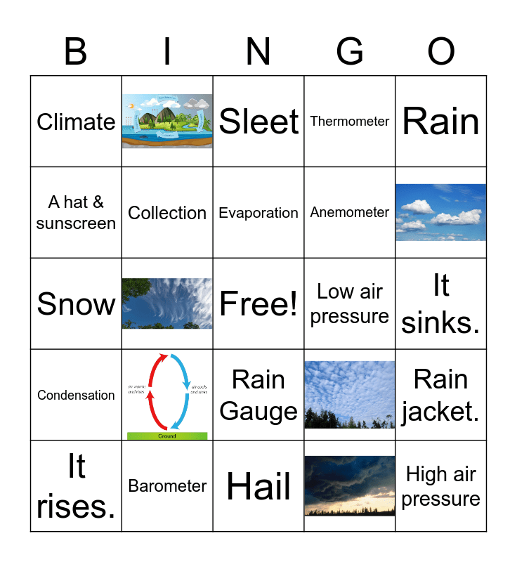 This bingo card has 6 images, a free space and 18 words: Barometer, Evaporation, It rises., Rain, Climate, A hat & sunscreen, Low air pressure, Rain Gauge, Anemometer, Snow, Rain jacket., Collection, It sinks., Sleet, High air pressure, Condensation, Thermometer and Hail.