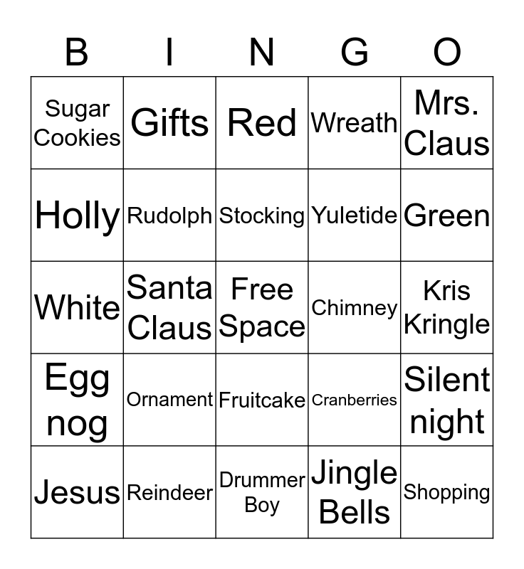This bingo card has a free space and 24 words: Ornament, Reindeer, Stocking, Jesus, Mrs. Claus, Sugar Cookies, Holly, Gifts, Chimney, Fruitcake, Yuletide, White, Cranberries, Silent night, Rudolph, Jingle Bells, Kris Kringle, Red, Green, Santa Claus, Shopping, Egg nog, Wreath and Drummer Boy.