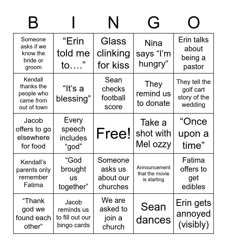 This bingo card has a free space and 24 words: “God brought us together”, Jacob reminds us to fill out our bingo cards, Sean checks football score, “Thank god we found each other”, Erin talks about being a pastor, Someone asks if we know the bride or groom, Kendall thanks the people who came from out of town, “Erin told me to….”, Take a shot with Mel ozzy, Someone asks us about our churches, They remind us to donate, Jacob offers to go elsewhere for food, Announcement that the movie is starting, Fatima offers to get edibles, “It’s a blessing”, Sean dances, “Once upon a time”, Glass clinking for kiss, They tell the golf cart story of the wedding, Every speech includes “god”, Erin gets annoyed (visibly), Kendall’s parents only remember Fatima, Nina says “I’m hungry” and We are asked to join a church.