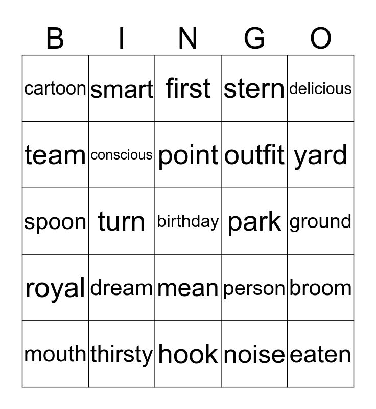 This bingo card has a free space and 24 words: dream, thirsty, point, mouth, delicious, cartoon, team, smart, park, mean, outfit, spoon, person, broom, conscious, noise, ground, first, yard, turn, eaten, royal, stern and hook.