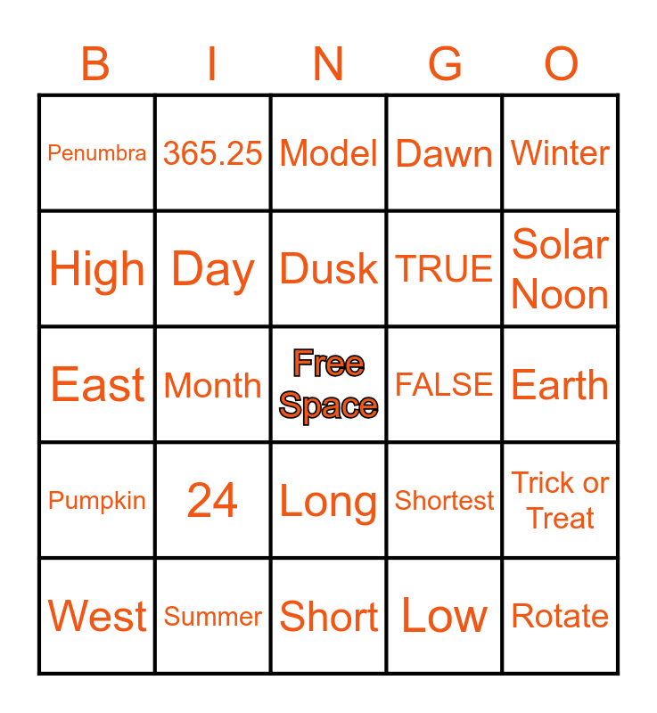 This bingo card has a free space and 34 words: Apparent, Low, Shadow, Year, Pumpkin, Day, Winter, West, 365.25, Apparent Path of the Sun, Dusk, Model, Umbra, Sun, FALSE, Solar Noon, Summer, East, 24, Shortest, Long, Orbit, Penumbra, Earth, Short, Rotate, Dawn, Moon, TRUE, High, Axis, Month, Trick or Treat and Halloween.