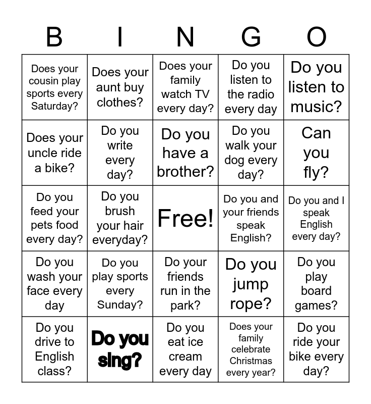 This bingo card has a free space and 24 words: Do you play sports every Sunday?, Do you sing?, Do you have a brother?, Do you drive to English class?, Do you listen to music?, Does your cousin play sports every Saturday?, Does your uncle ride a bike?, Does your aunt buy clothes?, Do you and your friends speak English?, Do your friends run in the park?, Do you walk your dog every day?, Do you feed your pets food every day?, Do you jump rope?, Do you play board games?, Do you write every day?, Does your family celebrate Christmas every year?, Do you and I speak English every day?, Does your family watch TV every day?, Can you fly?, Do you brush your hair everyday?, Do you ride your bike every day?, Do you wash your face every day, Do you listen to the radio every day and Do you eat ice cream every day.
