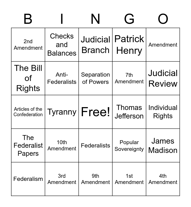 This bingo card has a free space and 35 words: 3/5ths Compromise, Executive Branch, Republicanism, Anti-Federalists, Federalists, Patrick Henry, The Bill of Rights, Ratify, Separation of Powers, The Constitutional Convention, Articles of the Confederation, Amendment, Legislative Branch, George Washington, 2nd Amendment, Thomas Jefferson, 1st Amendment, Tyranny, The Federalist Papers, 4th Amendment, Popular Sovereignty, Federalism, James Madison, 3rd Amendment, Judicial Branch, Judicial Review, 5th Amendment, 6th Amendment, 7th Amendment, Individual Rights, Limited Government, 9th Amendment, 10th Amendment, Checks and Balances and Alexander Hamilton.