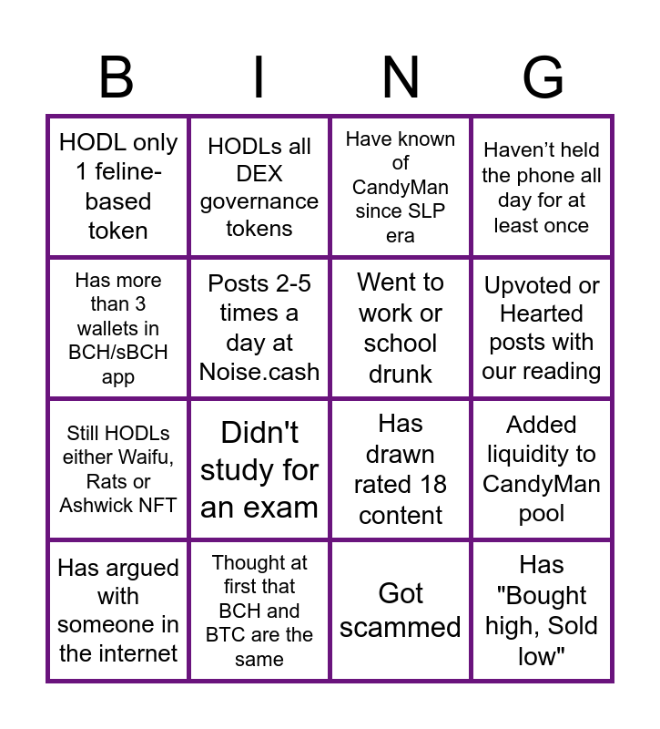 This bingo card has 16 words: Has argued with someone in the internet, Thought at first that BCH and BTC are the same, Have known of CandyMan since SLP era, Haven’t held the phone all day for at least once, Has more than 3 wallets in BCH/sBCH app, HODLs all DEX governance tokens, Has drawn rated 18 content, Added liquidity to CandyMan pool, HODL only 1 feline-based token, Posts 2-5 times a day at Noise.cash, Got scammed, Upvoted or Hearted posts with our reading, Still HODLs either Waifu, Rats or Ashwick NFT, Didn't study for an exam, Went to work or school drunk and Has "Bought high, Sold low".