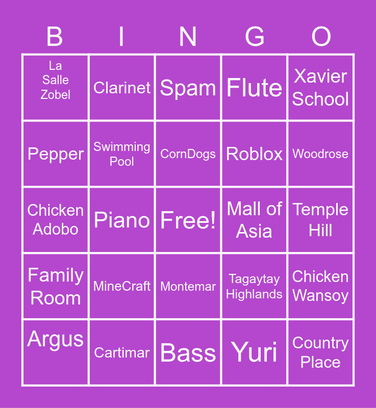 This bingo card has a free space and 29 words: Argus, Assumption College, Piano, Pavillion, La Salle Zobel, Spam, Swimming Pool, MineCraft, Mall of Asia, Cartimar, Temple Hill, Country Place, Bass, Yuri, Woodrose, Vienna Sausage, Montemar, Family Room, Xavier School, Chicken Adobo, Tagaytay Highlands, Koya, Roblox, Pepper, Flute, Clarinet, Chicken Wansoy, CornDogs and Ilocos Empanada.