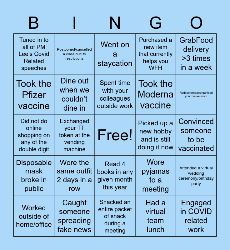This bingo card has a free space and 34 words: Disconnected from your meeting, Had a virtual team lunch, Had kids/pets/aeroplanes interrupt you while you’re in meeting, Took >1 ART test in a week, Disposable mask broke in public, Dine out when we couldn’t dine in, GrabFood delivery >3 times in a week, Worked outside of home/office, Postponed/cancelled a class due to restrictions, Forgot to mute yourself in a meeting, Spent time with your colleagues outside work, Went on a staycation, Started and finished a new Netflix Series in a week, Jogged 4 times a week, Picked up a new hobby and is still doing it now, Redecorated/reorganised your house/room, Caught someone spreading fake news, Did not do online shopping on any of the double digit, Wore the same outfit 2 days in a row, Wore pyjamas to a meeting, Read 4 books in any given month this year, Did not go and check flight prices when VTL announced, Tuned in to all of PM Lee’s Covid Related speeches, Convinced someone to be vaccinated, Snacked an entire packet of snack during a meeting, Engaged in COVID related work, Purchased a new item that currently helps you WFH, Helped your child with home based learning, Took the Moderna vaccine, Took the Pfizer vaccine, Submitted a name for the newborn nameless Panda, Exchanged your TT token at the vending machine, Attended a virtual wedding ceremony/birthday party and Went for a meal as a group but sat separately.