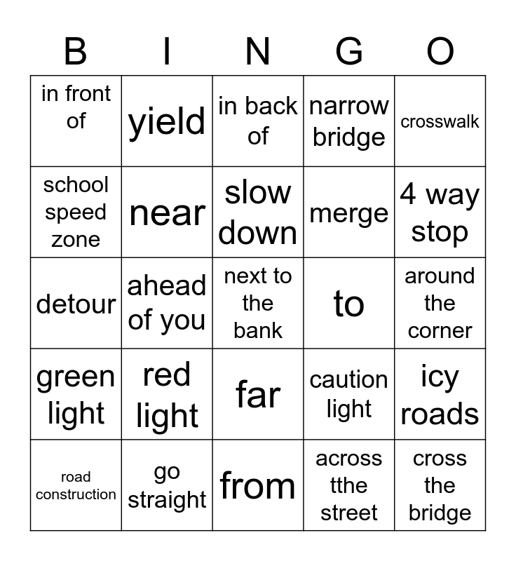 This bingo card has 30 words: go straight, down the road, ahead of you, in the middle of, in front of, in back of, near, far, to, from, around the corner, next to the bank, across tthe street, cross the bridge, 4 way stop, turn on the green arrow, caution light, green light, red light, crosswalk, detour, one way, yield, merge, school speed zone, narrow bridge, icy roads, road construction, slow down and speed limit.