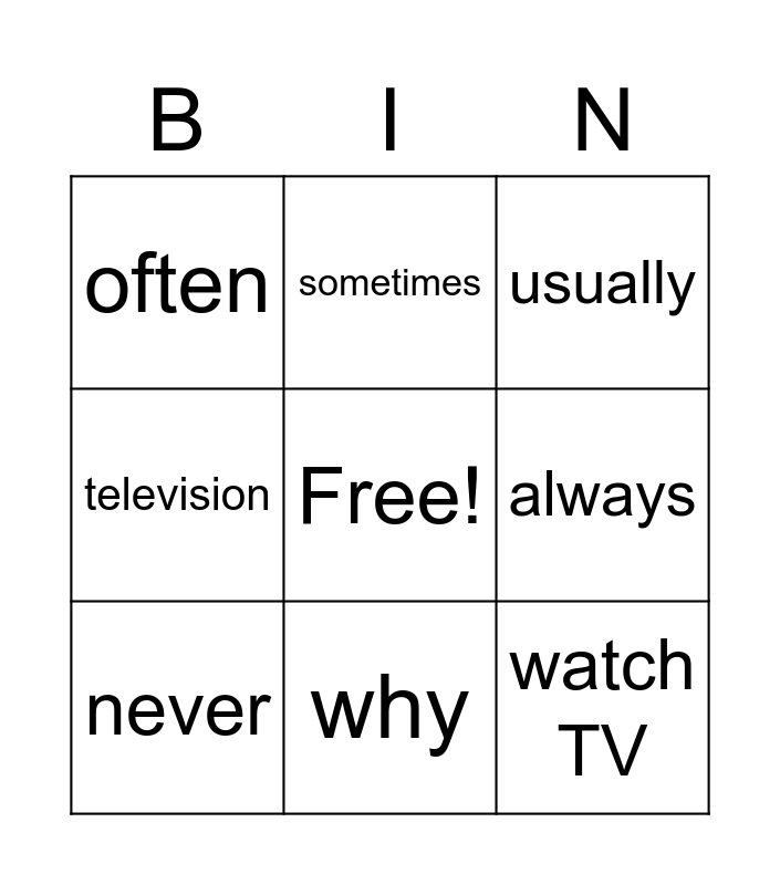 This bingo card has a free space and 8 words: always, usually, sometimes, never, often, watch TV, television and why.