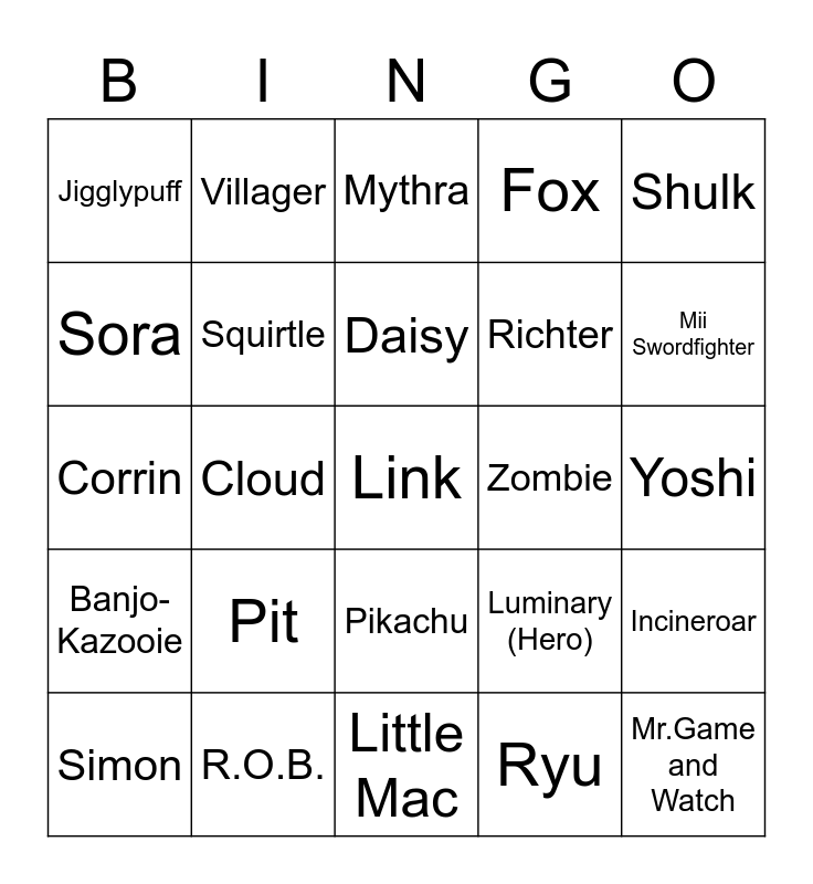 This bingo card has 25 words: Pit, Little Mac, Daisy, Simon, Shulk, Jigglypuff, Sora, Villager, Zombie, Pikachu, Richter, Corrin, Luminary (Hero), Incineroar, Squirtle, Mr.Game and Watch, Yoshi, Mythra, Mii Swordfighter, Cloud, Link, R.O.B., Banjo-Kazooie, Fox and Ryu.