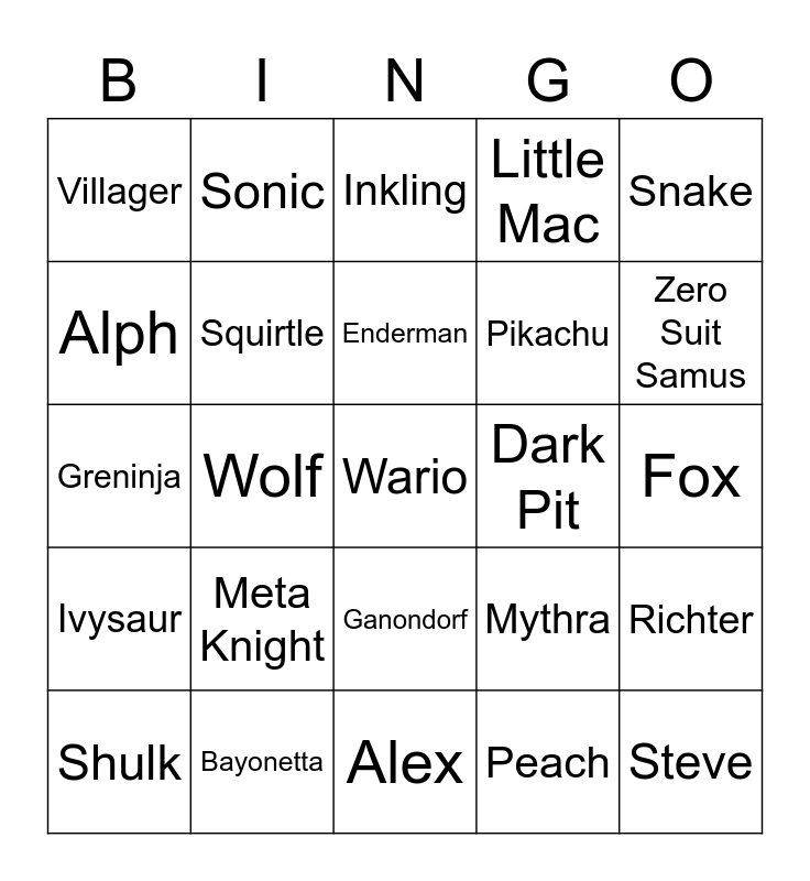This bingo card has 25 words: Meta Knight, Alex, Enderman, Shulk, Snake, Villager, Alph, Sonic, Dark Pit, Ganondorf, Pikachu, Greninja, Mythra, Richter, Squirtle, Steve, Fox, Inkling, Zero Suit Samus, Wolf, Wario, Bayonetta, Ivysaur, Little Mac and Peach.