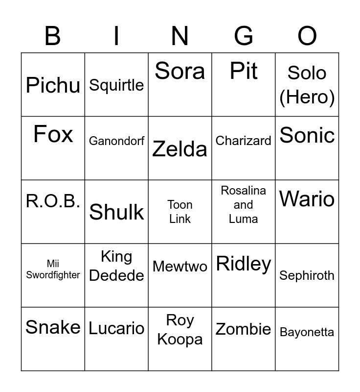 This bingo card has a free space and 24 words: King Dedede, Lucario, Zelda, Snake, Solo (Hero), Pichu, Fox, Squirtle, Rosalina and Luma, Mewtwo, Charizard, R.O.B., Ridley, Sephiroth, Ganondorf, Zombie, Wario, Sora, Sonic, Shulk, Bayonetta, Mii Swordfighter, Pit and Roy Koopa.