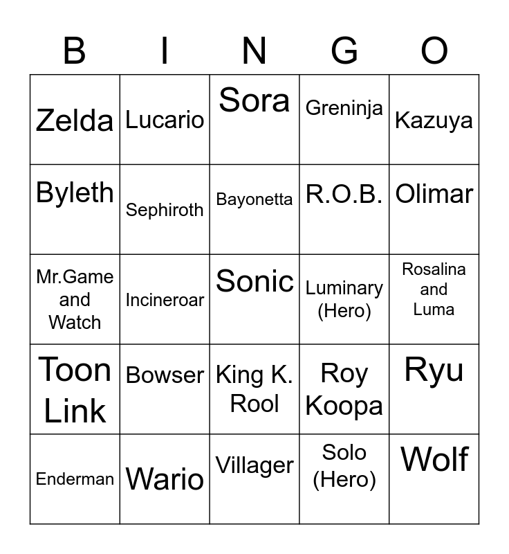 This bingo card has a free space and 24 words: Bowser, Wario, Bayonetta, Enderman, Kazuya, Zelda, Byleth, Lucario, Luminary (Hero), King K. Rool, R.O.B., Mr.Game and Watch, Roy Koopa, Ryu, Sephiroth, Solo (Hero), Rosalina and Luma, Sora, Olimar, Incineroar, Wolf, Toon Link, Greninja and Villager.
