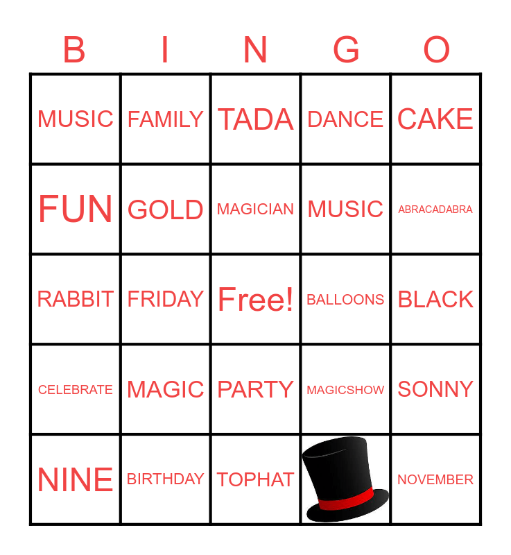 This bingo card has 1 images, a free space and 24 words: MAGIC, TOPHAT, MAGICIAN, NINE, CAKE, MUSIC, FUN, FAMILY, BALLOONS, PARTY, MUSIC, RABBIT, MAGICSHOW, SONNY, GOLD, RED, BLACK, TADA, ABRACADABRA, FRIDAY, NOVEMBER, BIRTHDAY, CELEBRATE and DANCE.