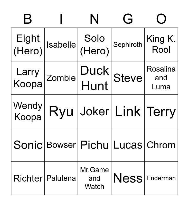 This bingo card has 25 words: Bowser, Mr.Game and Watch, Duck Hunt, Richter, King K. Rool, Eight (Hero), Larry Koopa, Isabelle, Link, Pichu, Steve, Wendy Koopa, Lucas, Chrom, Zombie, Enderman, Terry, Solo (Hero), Rosalina and Luma, Ryu, Joker, Palutena, Sonic, Sephiroth and Ness.