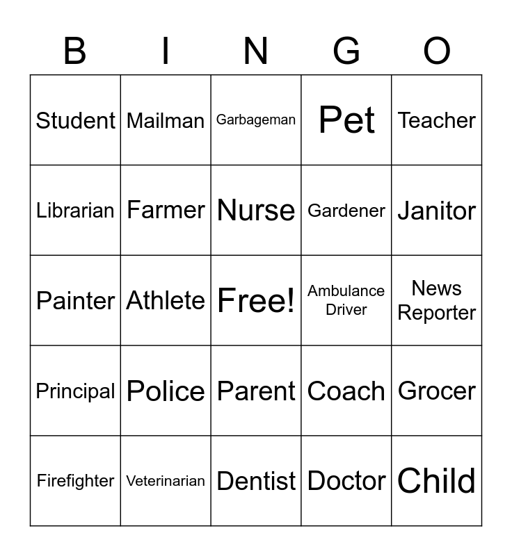 This bingo card has a free space and 24 words: Firefighter, Police, Nurse, Doctor, Teacher, Student, Mailman, Garbageman, Ambulance Driver, News Reporter, Painter, Farmer, Coach, Grocer, Librarian, Veterinarian, Dentist, Pet, Janitor, Principal, Athlete, Parent, Gardener and Child.