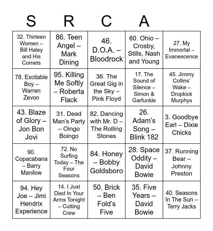 This bingo card has 100 words: 1. Die Young – Ke$ha, 2. People Who Died – Jim Carroll, 3. Goodbye Earl – Dixie Chicks, 4. Knockin’ on Heaven’s Door – Bob Dylan, 5. New York Mining Disaster (1941) – Bee Gees, 6. Last Kiss – Frank J. Wilson (or Pearl Jam), 7. Stagger Lee – Lloyd Price, 8. Tears In Heaven – Eric Clapton, 9. Fade To Black – Metallica, 10. Freddy’s Dead (Theme From Superfly) – Curtis Mayfield, 11. Leader of the Pack – Shangri-Las, 12. If I Die Young – The Band Perry, 13. There Is A Light That Never Goes Out – The Smiths, 14. I Just Died In Your Arms Tonight – Cutting Crew, 15. Bohemian Rhapsody (this song is ona lot of lists!), 16. Shannon – Henry Gross, 17. The Sound of Silence – Simon & Garfunkle, 18. Another One Bites The Dust – Queen, 19. (Don’t Fear) The Reaper – Blue Oyster Cult, 20. I’ll Fly Away – Hank Williams, 21. Maxwell’s Silver Hammer – the Beatles, 22. Ding Dong! The Witch Is Dead – the Munchkins, 23. I Will Follow You Into the Dark – Death Cab For Cutie, 24. Ready To Die – The Notorious B.I.G., 25. Candle in the Wind – Elton John, 26. Adam’s Song – Blink 182, 27. My Immortal – Evanescence, 28. Space Oddity – David Bowie, 29. I’ll Be Missing You - Puff Daddy & The Family, Faith Evans, 30. I Don’t Like Mondays – Boomtown Rats, 31. Dead Man’s Party – Oingo Boingo, 32. Thirteen Women – Bill Haley and His Comets, 33. Gone Too Soon – Daughtry, 34. He Stopped Loving Her Today – George Jones, 35. Five Years – David Bowie, 36. The Great Gig in the Sky – Pink Floyd, 37. Running Bear – Johnny Preston, 38. Lighting Crashes – Live, 39. Stole – Kelly Rowland, 40. Seasons In The Sun – Terry Jacks, 41. Jeremy – Pearl Jam, 42. Close My Eyes Forever – Lita Ford & Ozzy Osbourne, 43. Blaze of Glory – Jon Bon Jovi, 44. Billy Don’t be a Hero – Bo Donaldson and the Haywoods, 45. Jimmy Collins’ Wake – Dropkick Murphys, 46. D.O.A. – Bloodrock, 47. Only the Good Die Young – Billy Joel, 48. The Killing of Georgie – Rod Stewart, 49. Once You Understand – Think, 50. Brick – Ben Fold’s Five, 51. Live and Let Die – Paul McCartney and Wings, 52. Ode To Billy Jo – Bobbie Gentry, 53. Keep Me in Your Heart – Warren Zevon, 54. The Night The Lights Went Out In Georgia – Vicki Lawrence, 55. The Wreck of the Edmund Fitzgerald – Gordon Lightfoot, 56. Usta Love Her – Guns N Roses, 57. Die Young, Stay Pretty – Blondie, 58. Ocean Breathes Salty – Modest Mouse, 59. Alone Again (Naturally) – Gilbert O’Sullivan, 60. Ohio – Crosby, Stills, Nash and Young, 61. Do You Realize?? – The Flaming Lips, 62. Heaven – Beyonce Knowles, 63. The Show Must Go On – Queen, 64. Tha Crossroads – Bone Thugs-n-Harmony, 65. Going, Going, Gone – Bob Dylan, 66. In My Time of Dying – Led Zeppelin, 67. Coldest Winter – Kanye West, 68. Let It Be – The Beatles, 69. Three Bells – The Browns, 70. Whiskey Lullaby – Brad Paisley and Alison Krauss, 71. Dead Man’s Curve – Jan and Dean, 72. No Surfing Today – The Four Seasons, 73. Run Joey Run – David Geddes, 74. Let It Die – Foo Fighters, 75. Tell Laura I Love Her – Ray Peterson, 76. How To Save A Life – The Fray, 77. Can’t Stand Losing You – The Police, 78. Excitable Boy – Warren Zevon, 79. The Legend Of Tom Dooley – The Kingston Trio, 80. Done Too Soon – Neil Diamond, 81. The Last Carnival – Bruce Springsteen, 82. Dancing with Mr. D – The Rolling Stones, 83. Volcano – Jimmy Buffett, 84. Honey – Bobby Goldsboro, 85. And When I Die – Blood, Sweat and Tears, 86. Teen Angel – Mark Dining, 87. Stan – Eminem, 88. Susie And Jeffrey – Blondie, 89. Paint It Black – Rolling Stones, 90. Copacabana – Barry Manilow, 91. Prayer For The Dying – Seal, 92. I Would Die 4 U – Prince, 93. I Gotta Get A Message To You – Bee Gees, 94. Hey Joe – Jimi Hendrix Experience, 95. Killing Me Softly – Roberta Flack, 96. The Water Was Red – Johnny Cymbal, 97. Eleanor Rigby – The Beatles, 98. Killing An Arab – The Cure, 99. Dancing With Tears In My Eyes – Ultravox and 100. The Freshman – Verve Pipe.