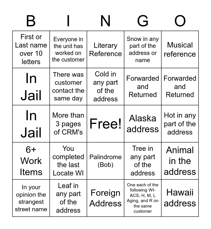 This bingo card has a free space and 28 words: Animal in the address, Pilgrim in any part of the address, Forwarded and Returned, One each of the following WI-ACS, H, M, L Aging, and R on the same customer, In Jail, Literary Reference, Everyone in the unit has worked on the customer, 6+ Work Items, Alaska address, In your opinion the strangest street name, In Jail, Snow in any part of the address or name, Leaf in any part of the address, Foreign Address, Forwarded and Returned, Fall in any part of the address, You completed the last Locate WI, There was customer contact the same day, Cold in any part of the address, Palindrome (Bob), First or Last name over 10 letters, Name Change, Hawaii address, More than 3 pages of CRM's, Hot in any part of the address, Tree in any part of the address, Musical reference and Money in any part of the address.