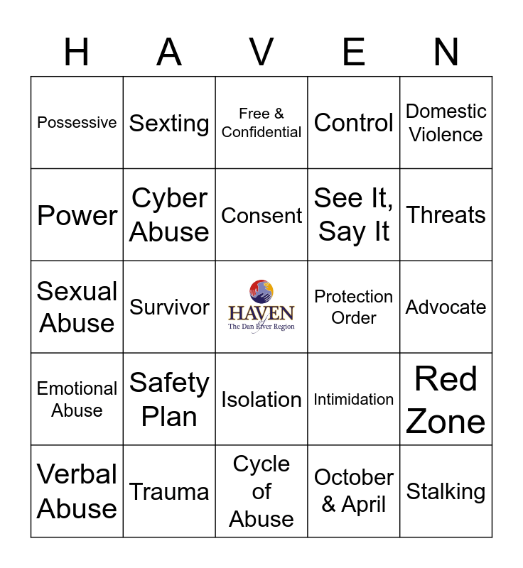 This bingo card has a free space and 24 words: Safety Plan, Trauma, Consent, Verbal Abuse, Domestic Violence, Possessive, Power, Sexting, Protection Order, Isolation, See It, Say It, Sexual Abuse, Intimidation, Red Zone, Cyber Abuse, October & April, Advocate, Free & Confidential, Threats, Survivor, Stalking, Emotional Abuse, Control and Cycle of Abuse.