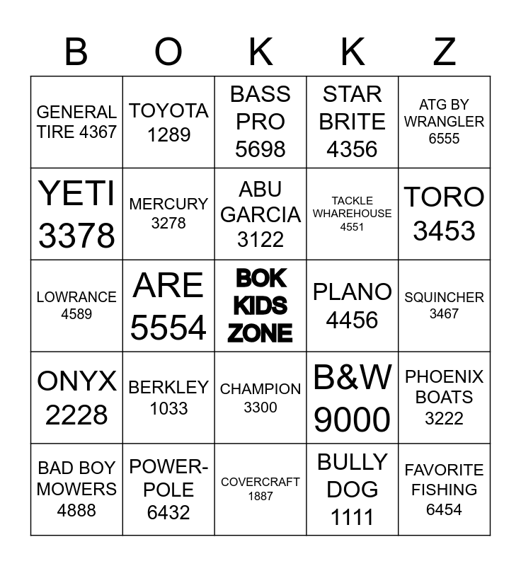 This bingo card has a free space and 25 words: BAD BOY MOWERS 4888, BERKLEY 1033, ABU GARCIA 3122, BULLY DOG 1111, TORO 3453, GENERAL TIRE 4367, TOYOTA 1289, BASS PRO 5698, TACKLE WHAREHOUSE 4551, PHOENIX BOATS 3222, LOWRANCE 4589, MERCURY 3278, B&W 9000, FAVORITE FISHING 6454, YETI 3378, POWER-POLE 6432, COVERCRAFT 1887, STAR BRITE 4356, SQUINCHER 3467, ONYX 2228, ARE 5554, CHAMPION 3300, PLANO 4456, ATG BY WRANGLER 6555 and BAD BOY MOWERS 4888.