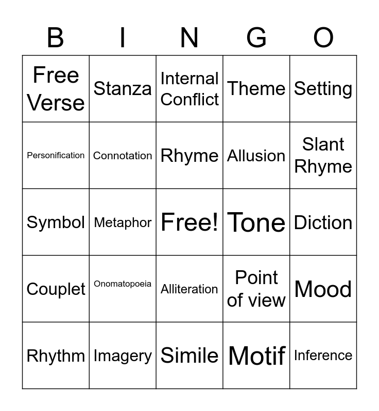 This bingo card has a free space and 24 words: Onomatopoeia, Imagery, Rhyme, Rhythm, Setting, Free Verse, Personification, Stanza, Tone, Alliteration, Allusion, Symbol, Point of view, Mood, Connotation, Motif, Diction, Internal Conflict, Slant Rhyme, Metaphor, Inference, Couplet, Theme and Simile.