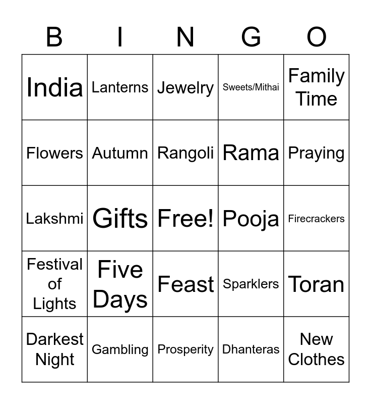 This bingo card has a free space and 25 words: Five Days, Prosperity, Rangoli, Darkest Night, Family Time, India, Flowers, Lanterns, Pooja, Feast, Rama, Lakshmi, Sparklers, Toran, Autumn, Good fortune, Firecrackers, Jewelry, Praying, Gifts, New Clothes, Gambling, Festival of Lights, Sweets/Mithai and Dhanteras.