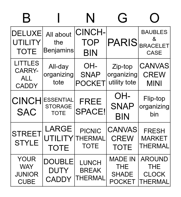 This bingo card has a free space and 24 words: LARGE UTILITY TOTE, DOUBLE DUTY CADDY, OH-SNAP POCKET, YOUR WAY JUNIOR CUBE, BAUBLES & BRACELET CASE, DELUXE UTILITY TOTE, LITTLES CARRY-ALL CADDY, All about the Benjamins, OH-SNAP BIN, PICNIC THERMAL TOTE, Zip-top organizing utility tote, CINCH SAC, CANVAS CREW TOTE, FRESH MARKET THERMAL, All-day organizing tote, MADE IN THE SHADE POCKET, Flip-top organizing bin, CINCH-TOP BIN, CANVAS CREW MINI, ESSENTIAL STORAGE TOTE, AROUND THE CLOCK THERMAL, STREET STYLE, PARIS and LUNCH BREAK THERMAL.