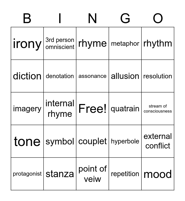 This bingo card has a free space and 24 words: symbol, stanza, assonance, protagonist, rhythm, irony, diction, 3rd person omniscient, quatrain, couplet, allusion, imagery, hyperbole, external conflict, denotation, repetition, stream of consciousness, rhyme, resolution, internal rhyme, mood, tone, metaphor and point of veiw.