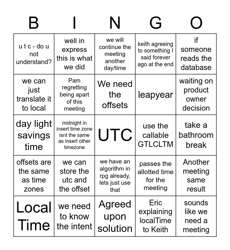 This bingo card has a free space and 24 words: we can store the utc and the offset, we need to know the intent, We need the offsets, Local Time, if someone reads the database, u t c - do u not understand?, we can just translate it to local, well in express this is what we did, use the callable GTLCLTM, we have an algorithm in rpg already, lets just use that, leapyear, day light savings time, passes the allotted time for the meeting, Another meeting same result, Pam regretting being apart of this meeting, Eric explaining localTime to Keith, take a bathroom break, we will continue the meeting another day/time, waiting on product owner decision, midnight in insert time zone isnt the same as insert other timezone, sounds like we need a meeting, offsets are the same as time zones, keith agreeing to something I said forever ago at the end and Agreed upon solution.