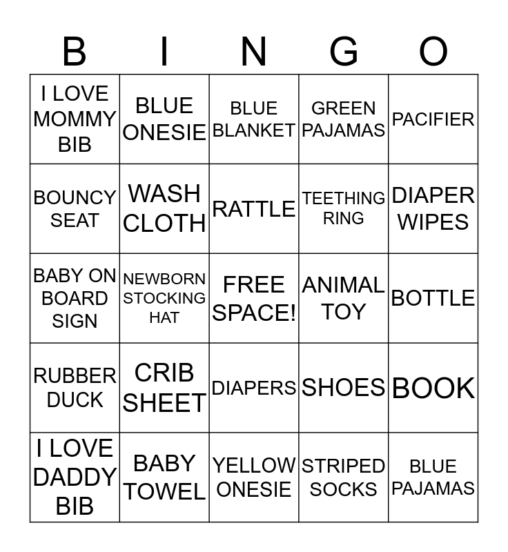 This bingo card has a free space and 24 words: CRIB SHEET, BABY TOWEL, RATTLE, I LOVE DADDY BIB, PACIFIER, I LOVE MOMMY BIB, BOUNCY SEAT, BLUE ONESIE, ANIMAL TOY, DIAPERS, TEETHING RING, BABY ON BOARD SIGN, SHOES, BOOK, WASH CLOTH, STRIPED SOCKS, BOTTLE, BLUE BLANKET, DIAPER WIPES, NEWBORN STOCKING HAT, BLUE PAJAMAS, RUBBER DUCK, GREEN PAJAMAS and YELLOW ONESIE.