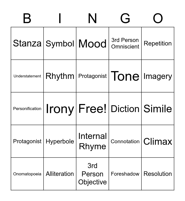 This bingo card has a free space and 24 words: Hyperbole, Alliteration, Protagonist, Onomatopoeia, Repetition, Stanza, Understatement, Symbol, Diction, Internal Rhyme, Tone, Personification, Connotation, Climax, Rhythm, Foreshadow, Simile, Mood, Imagery, Irony, Resolution, Protagonist, 3rd Person Omniscient and 3rd Person Objective.