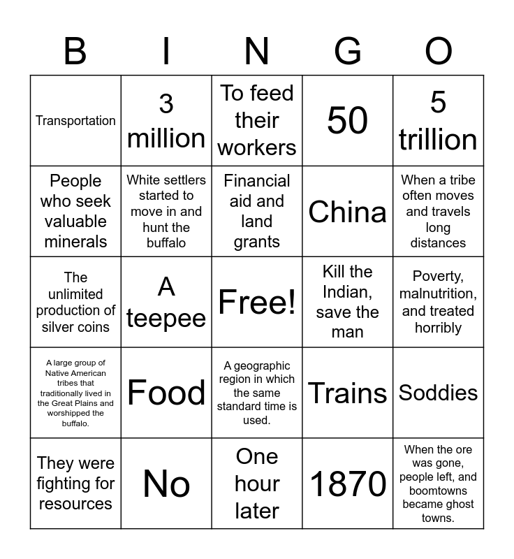 This bingo card has a free space and 24 words: They were fighting for resources, Food, Financial aid and land grants, 1870, 5 trillion, Transportation, 3 million, To feed their workers, Kill the Indian, save the man, Poverty, malnutrition, and treated horribly, The unlimited production of silver coins, White settlers started to move in and hunt the buffalo, Trains, Soddies, People who seek valuable minerals, No, One hour later, 50, When a tribe often moves and travels long distances, A large group of Native American tribes that traditionally lived in the Great Plains and worshipped the buffalo., A teepee, A geographic region in which the same standard time is used., China and When the ore was gone, people left, and boomtowns became ghost towns..