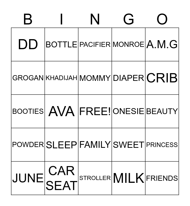 This bingo card has a free space and 28 words: PRINCESS, BABY, DIAPER, MILK, GROGAN, PACIFIER, BOTTLE, POWDER, ONESIE, JUNE, BOOTIES, MONROE, CAR SEAT, STROLLER, CRIB, BURP, SLEEP, KHADIJAH, MOMMY, FAMILY, DD, LOVE, FRIENDS, AVA, BEAUTY, SWEET, A.M.G and SPECIAL.