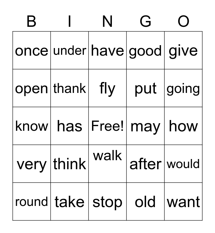 This bingo card has a free space and 24 words: think, take, fly, round, give, once, open, under, may, walk, put, know, after, would, thank, old, how, have, going, has, want, very, good and stop.