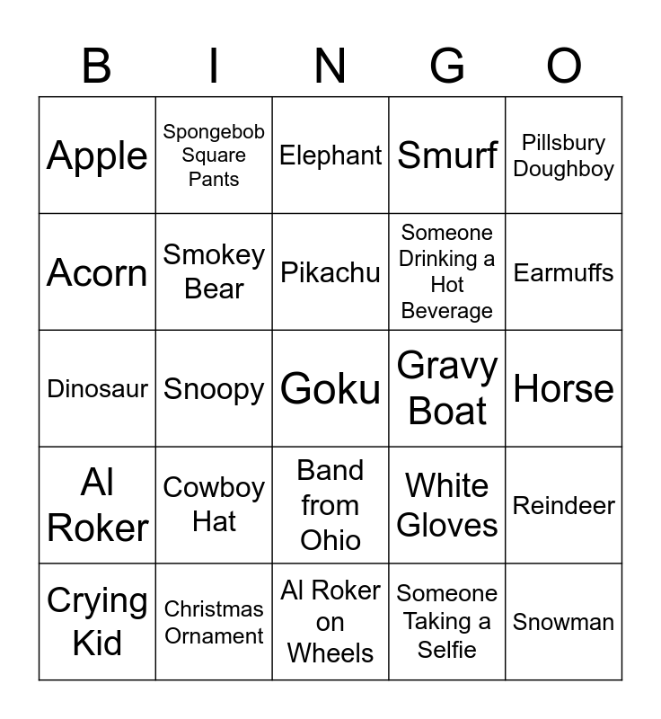 This bingo card has 77 words: Gator, Peacock, Elephant, Big Bird, Ronald McDonald, Turkey, Cupcake, Mount Rushmore, Giraffe, Mailbox, Snowman, Grogu, Pikachu, Acorn, Pirate, Snoopy, Candy Cane, Goku, Hippo, Pillsbury Doughboy, Pumpkin, Dinosaur, Smokey Bear, Spongebob Square Pants, Smurf, Foreigner, Kristin Chenoweth, Zoe Wees, Clown, Nose Picker, Fur Collar, Black Vest, Suspenders, White Gloves, Earmuffs, Someone Drinking a Hot Beverage, Flute, Red Shoes, Horse, Someone Taking a Selfie, Rockette, Pom Pom, Flag, White Coat, Present, Trombone, Crying Kid, Apple, Red Scarf, Band from Illinois, Band from Texas, Band from Ohio, Band from Virginia, Baseball, Party Hat, Clown with Blue Hair, Suspenders, Clown with Green Hair, Straw Hat, Someone Waving, Cowboy Hat, Someone Wearing Sunglasses, Umbrella, Santa Claus, Flowers, Drum, Tuba, Gravy Boat, Bowling Pin, Nutcracker, Polka Dots, Reindeer, Al Roker, Christmas Ornament, Dog, Al Roker on Wheels and Holiday Face Mask.