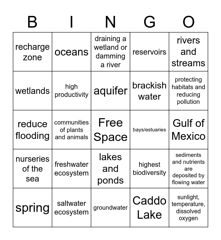 This bingo card has a free space and 24 words: freshwater ecosystem, saltwater ecosystem, aquifer, spring, rivers and streams, recharge zone, wetlands, oceans, bays/estuaries, lakes and ponds, brackish water, reduce flooding, highest biodiversity, sediments and nutrients are deposited by flowing water, high productivity, Caddo Lake, Gulf of Mexico, draining a wetland or damming a river, protecting habitats and reducing pollution, communities of plants and animals, sunlight, temperature, dissolved oxygen, nurseries of the sea, reservoirs and groundwater.