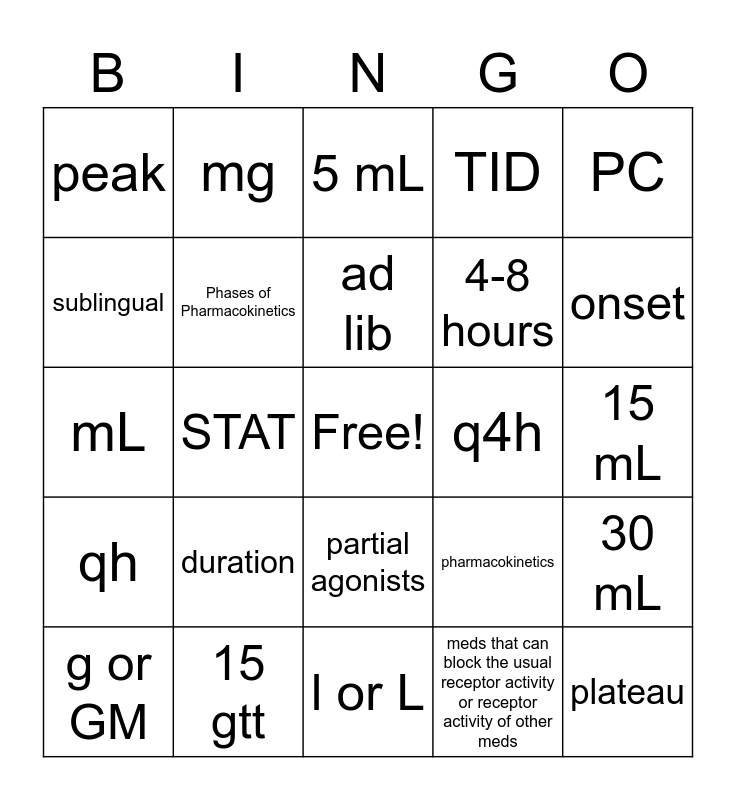 This bingo card has a free space and 36 words: q am, Daily, AC, Phases of Pharmacokinetics, pharmacokinetics, qh, ad lib, BID, PC, prn, STAT, TID, QID, q4h, onset, peak, trough, duration, plateau, 5 mL, 15 mL, 30 mL, 15 gtt, g or GM, l or L, mg, mL, more than 24 hours, 4-8 hours, sublingual, buccal, agonist, meds that can block the usual receptor activity or receptor activity of other meds, partial agonists, 0.5 mL and pharmacodynamics.