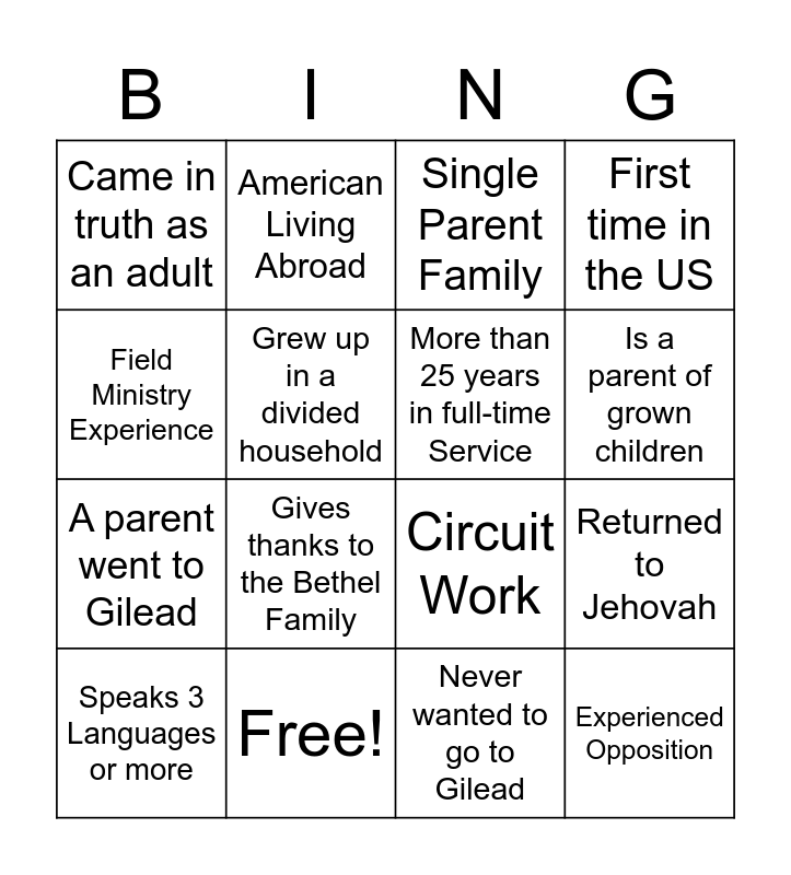 This bingo card has 16 words: Free!, Returned to Jehovah, Single Parent Family, Came in truth as an adult, A parent went to Gilead, American Living Abroad, Circuit Work, Never wanted to go to Gilead, Field Ministry Experience, Grew up in a divided household, Speaks 3 Languages or more, First time in the US, Gives thanks to the Bethel Family, Is a parent of grown children, More than 25 years in full-time Service and Experienced Opposition.