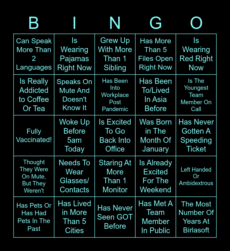 This bingo card has 25 words: Needs To Wear Glasses/ Contacts, Has Never Seen GOT Before, Has Been Into Workplace Post Pandemic, Has Pets Or Has Had Pets In The Past, Is Wearing Red Right Now, Can Speak More Than 2 Languages, Is Really Addicted to Coffee Or Tea, Is Wearing Pajamas Right Now, Was Born in The Month Of January, Staring At More Than 1 Monitor, Has Been To/Lived In Asia Before, Fully Vaccinated!, Is Already Excited For The Weekend, Left Handed Or Ambidextrous, Speaks On Mute And Doesn't Know It, The Most Number Of Years At Birlasoft, Has Never Gotten A Speeding Ticket, Grew Up With More Than 1 Sibling, Is The Youngest Team Member On Call, Woke Up Before 5am Today, Is Excited To Go Back Into Office, Has Lived in More Than 5 Cities, Thought They Were On Mute, But They Weren't, Has More Than 5 Files Open Right Now and Has Met A Team Member In Public.