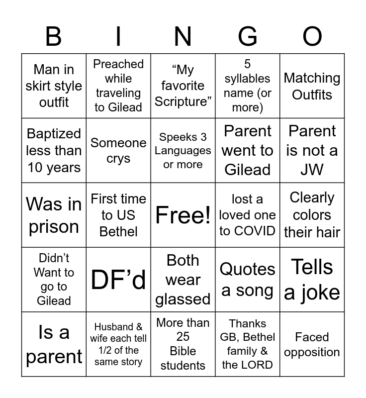 This bingo card has a free space and 24 words: DF’d, Husband & wife each tell 1/2 of the same story, Speeks 3 Languages or more, Is a parent, Matching Outfits, Man in skirt style outfit, Baptized less than 10 years, Preached while traveling to Gilead, lost a loved one to COVID, Both wear glassed, Parent went to Gilead, Was in prison, Quotes a song, Tells a joke, Someone crys, Thanks GB, Bethel family & the LORD, Clearly colors their hair, “My favorite Scripture”, Parent is not a JW, First time to US Bethel, Faced opposition, Didn’t Want to go to Gilead, 5 syllables name (or more) and More than 25 Bible students.