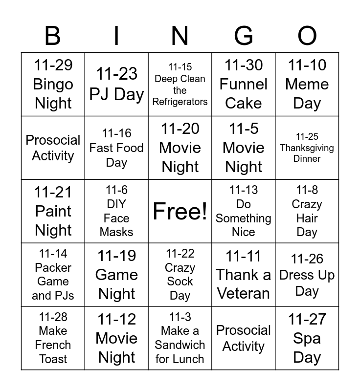This bingo card has a free space and 24 words: 11-19 Game Night, 11-12 Movie Night, 11-20 Movie Night, 11-28 Make French Toast, 11-10 Meme Day, 11-29 Bingo Night, Prosocial Activity, 11-23 PJ Day, 11-13 Do Something Nice, 11-22 Crazy Sock Day, 11-5 Movie Night, 11-21 Paint Night, 11-11 Thank a Veteran, 11-26 Dress Up Day, 11-16 Fast Food Day, Prosocial Activity, 11-8 Crazy Hair Day, 11-15 Deep Clean the Refrigerators, 11-25 Thanksgiving Dinner, 11-6 DIY Face Masks, 11-27 Spa Day, 11-14 Packer Game and PJs, 11-30 Funnel Cake and 11-3 Make a Sandwich for Lunch.