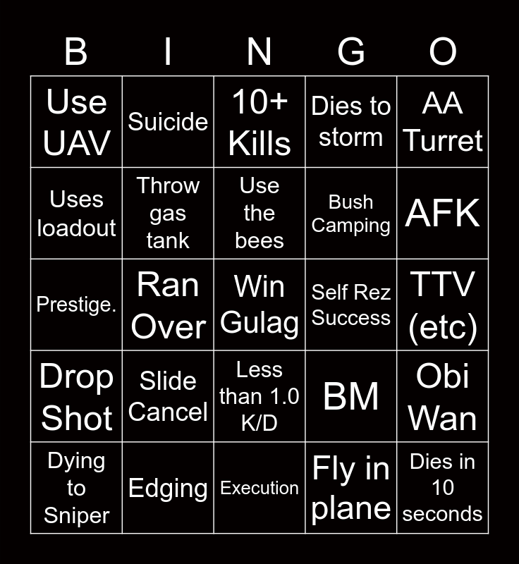This bingo card has a free space and 24 words: Slide Cancel, Edging, Use the bees, Dying to Sniper, AA Turret, Use UAV, Uses loadout, Suicide, Self Rez Success, Less than 1.0 K/D, Bush Camping, Prestige., BM, Obi Wan, Throw gas tank, Fly in plane, TTV (etc), 10+ Kills, AFK, Ran Over, Dies in 10 seconds, Drop Shot, Dies to storm and Execution.