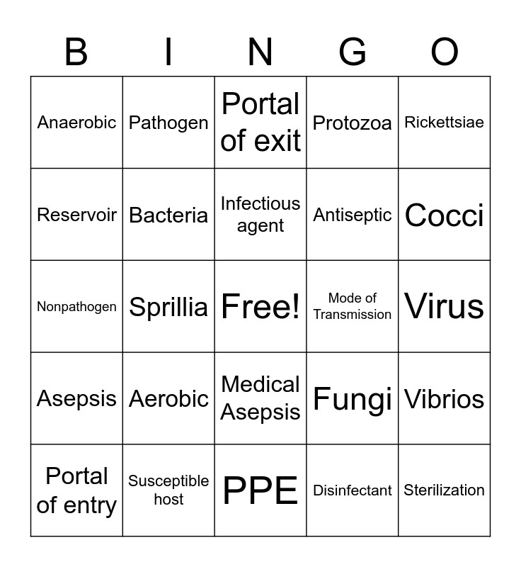 This bingo card has a free space and 24 words: Aerobic, Susceptible host, Infectious agent, Portal of entry, Rickettsiae, Anaerobic, Reservoir, Pathogen, Mode of Transmission, Medical Asepsis, Antiseptic, Nonpathogen, Fungi, Vibrios, Bacteria, Disinfectant, Virus, Portal of exit, Cocci, Sprillia, Sterilization, Asepsis, Protozoa and PPE.