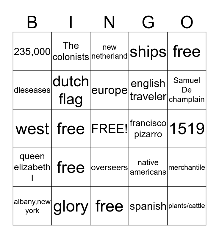 This bingo card has a free space and 24 words: free, glory, europe, albany,new york, free, 235,000, dieseases, The colonists, francisco pizarro, overseers, english traveler, west, native americans, merchantile, dutch flag, spanish, 1519, new netherland, Samuel De champlain, free, plants/cattle, queen elizabeth I, ships and free.