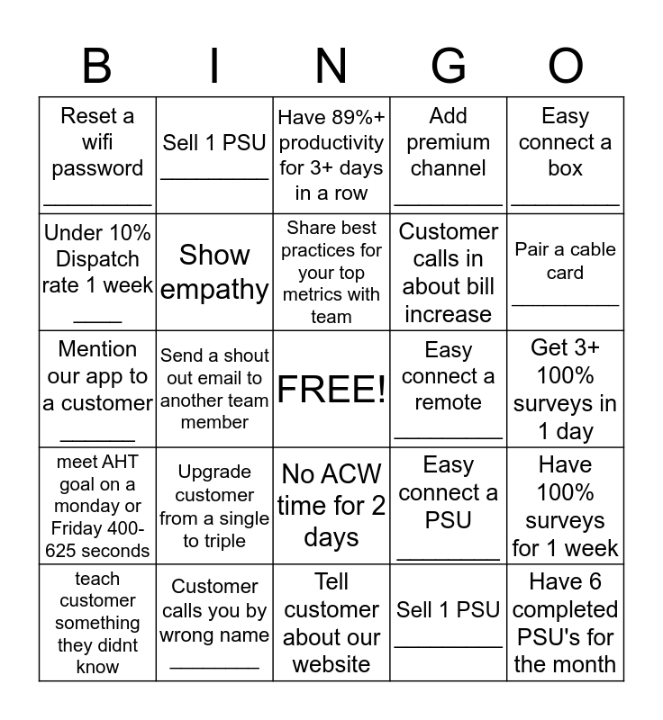 This bingo card has a free space and 24 words: Upgrade customer from a single to triple, Customer calls you by wrong name ________, Share best practices for your top metrics with team, teach customer something they didnt know, Easy connect a box _________, Reset a wifi password _________, Under 10% Dispatch rate 1 week ____, Sell 1 PSU _________, Easy connect a remote _________, No ACW time for 2 days, Customer calls in about bill increase, Mention our app to a customer ______, Easy connect a PSU ________, Have 100% surveys for 1 week, Show empathy, Sell 1 PSU _________, Get 3+ 100% surveys in 1 day, Have 89%+ productivity for 3+ days in a row, Pair a cable card __________, Send a shout out email to another team member, Have 6 completed PSU's for the month, meet AHT goal on a monday or Friday 400-625 seconds, Add premium channel _________ and Tell customer about our website.