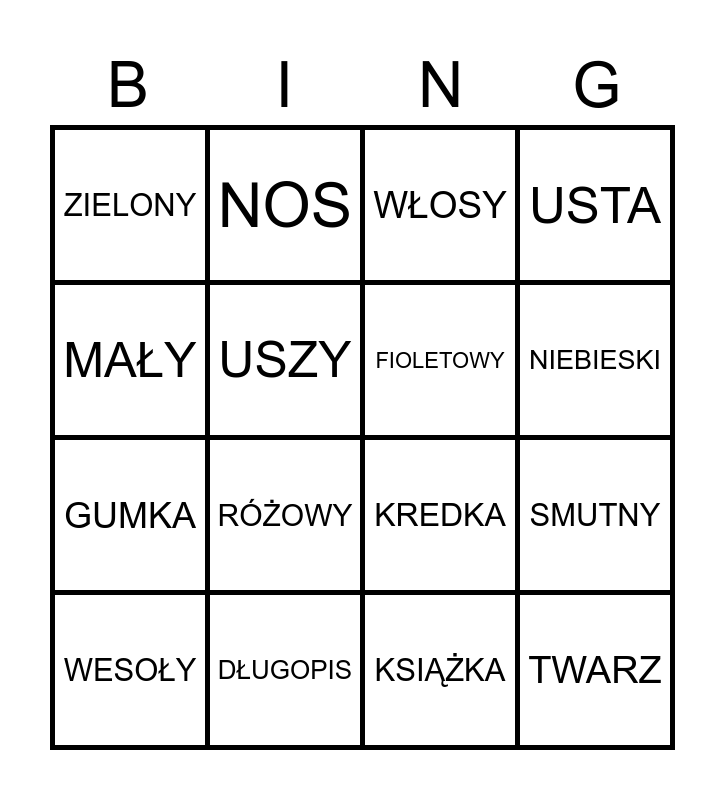 This bingo card has 27 words: Free!, LINIJKA, GUMKA, OCZY, USZY, WŁOSY, NOS, TWARZ, DŁUGOPIS, OŁÓWEK, KREDKA, USTA, BRĄZOWY, POMARAŃCZOWY, RÓŻOWY, ŻÓŁTY, FIOLETOWY, NIEBIESKI, CZERWONY, ZIELONY, KSIĄŻKA, KWIATEK, SMUTNY, WESOŁY, DUŻY, MAŁY and MISIEK.