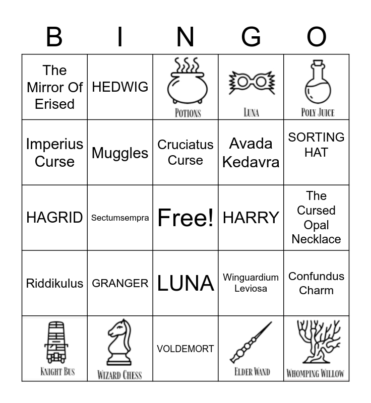 This bingo card has 11 images, a free space and 34 words: HARRY, LUNA, GRANGER, RON, VOLDEMORT, MALFOY, HAGRID, SIRIUS BLACK, SORTING HAT, HEDWIG, MOANING MYRTLE, Resurrection Stone, The Mirror Of Erised, The Goblet Of Fire, The Cursed Opal Necklace, Aguamenti, Alohomora, Winguardium Leviosa, Riddikulus, Petrificus Totalus, Confundus Charm, Lumos, Stupefy, Accio, Sectumsempra, Apparition, Expelliarmus, Obliviate, Cruciatus Curse, Imperius Curse, Avada Kedavra, Expecto Patronum, Muggles and The Burrow.